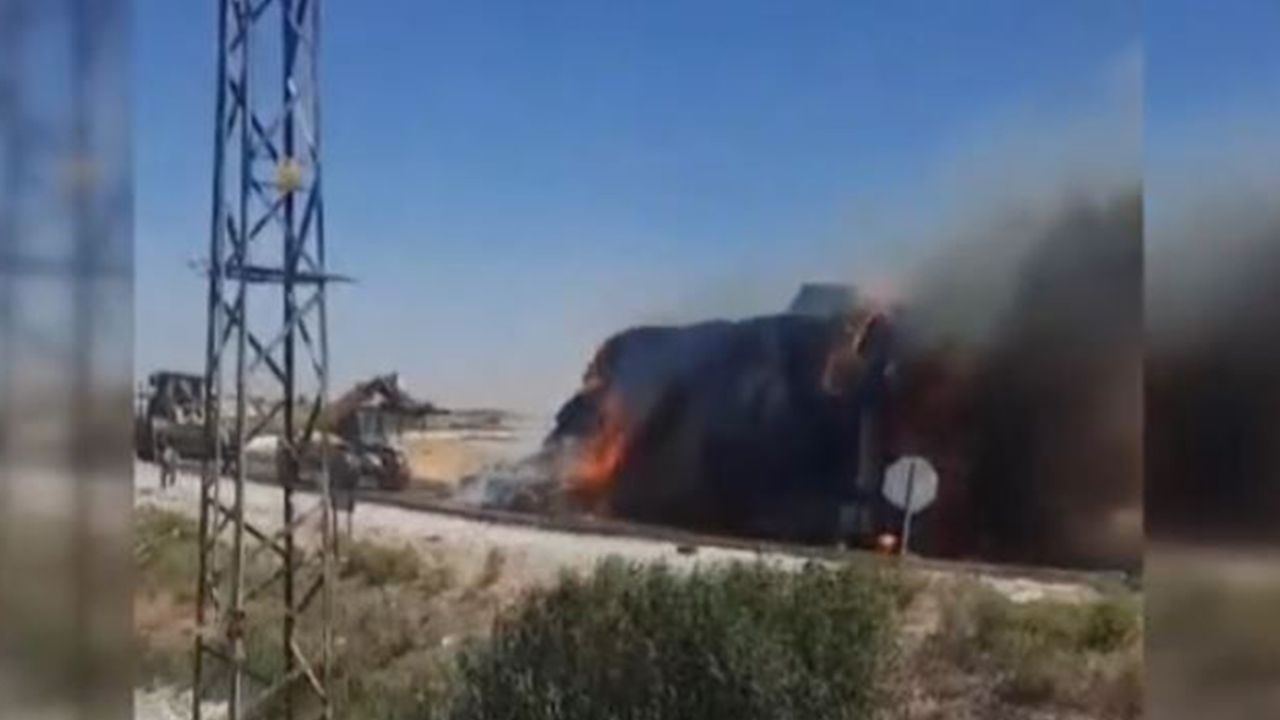 Konya’nın Karapınar ilçesinde 25 ton saman yüklü bir tır, park halindeyken çıkan yangında tamamen yandı.