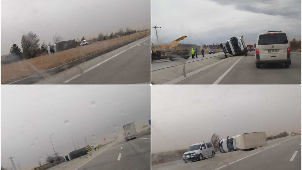 Kadınhanı ilçesinde şiddetli rüzgâr nedeniyle 3 tır devrilirken, Sarayönü ilçesinde ise 1 tır yan yattı.