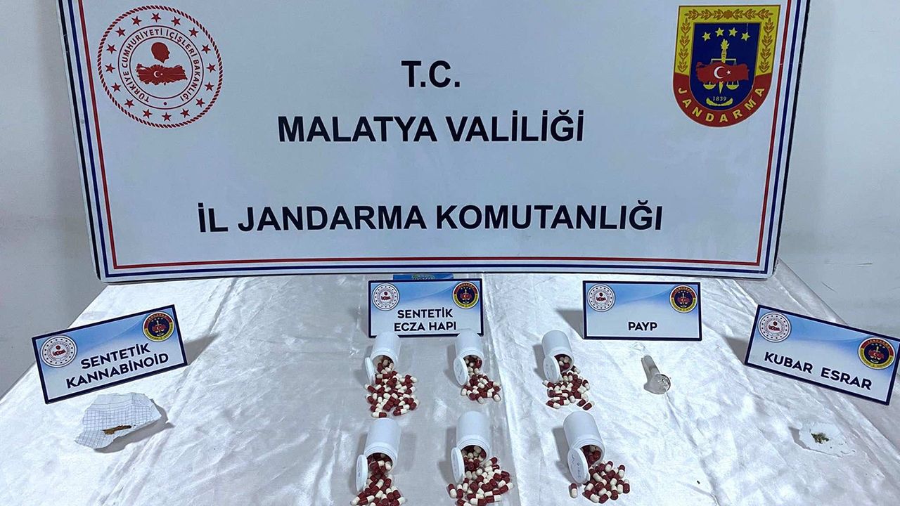 Narkotik Şube Müdürlüğü ile Battalgazi İlçe Jandarma Komutanlığı tarafından gerçekleştirilen operasyonda; 524 adet sentetik ecza hapı, 5 gram kubar esrar, 1 adet hassas terazi, 1 adet esrar öğütme aparatı, 2 adet 17 kalibre tabanca, 109 adet 38 milimetre fişek, 20 adet 7,65 milimetre fişek ve 29 adet 6,35 milimetre fişek ele geçirildi.