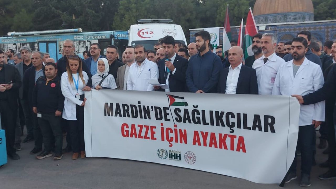 Gazze'de yaşanan insanlık durumuna dikkat çekmek amacıyla Mardin İl Sağlık Müdürlüğü ve STK’lar tarafından 15 Temmuz Parkı’nda “Sağlıkçılar Gazze için ayakta” sloganıyla basın açıklaması düzenlendi.