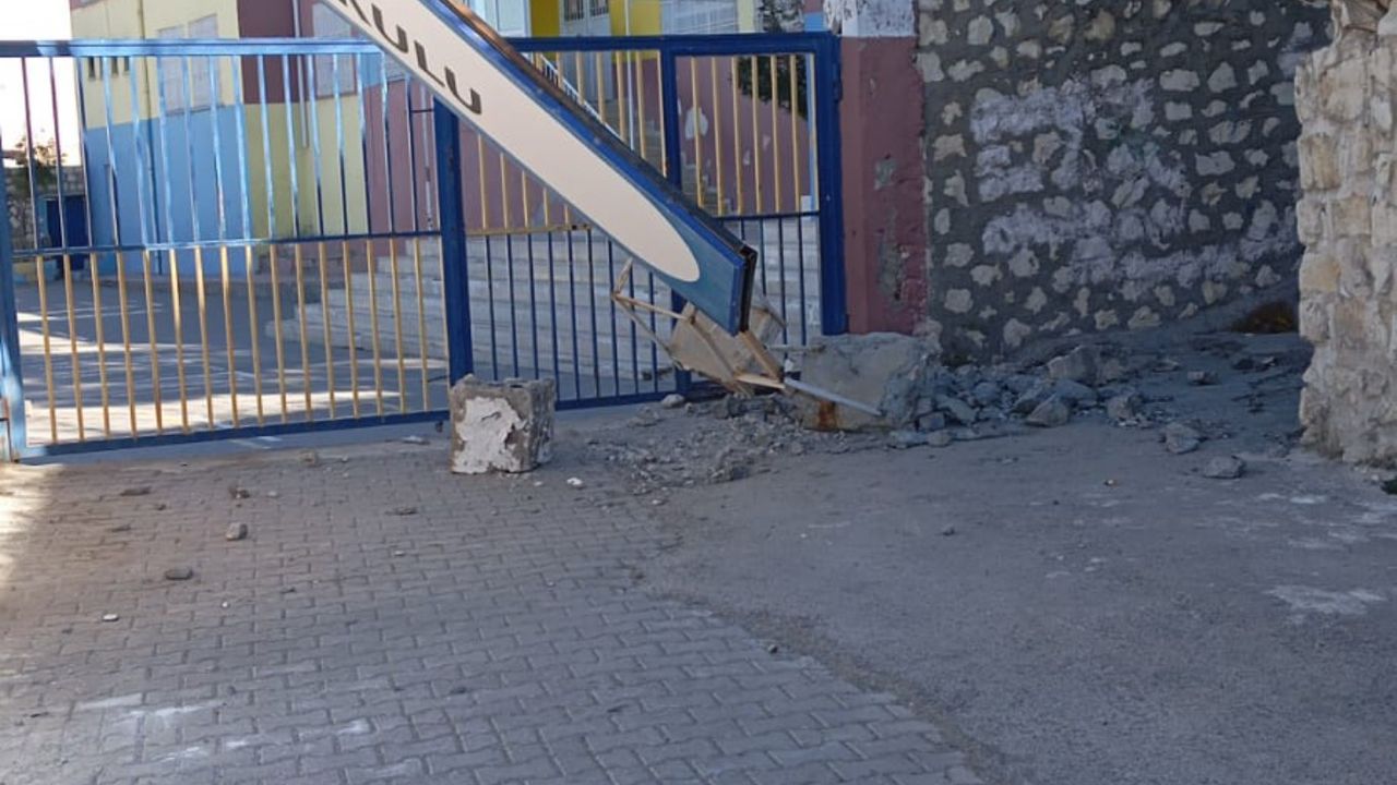 Şiddetli rüzgar, Artuklu Altınova İlkokulu tabelasını yerinden söktü.Okulların hafta sonu tatilinde olması, olası kazaların önüne geçti.