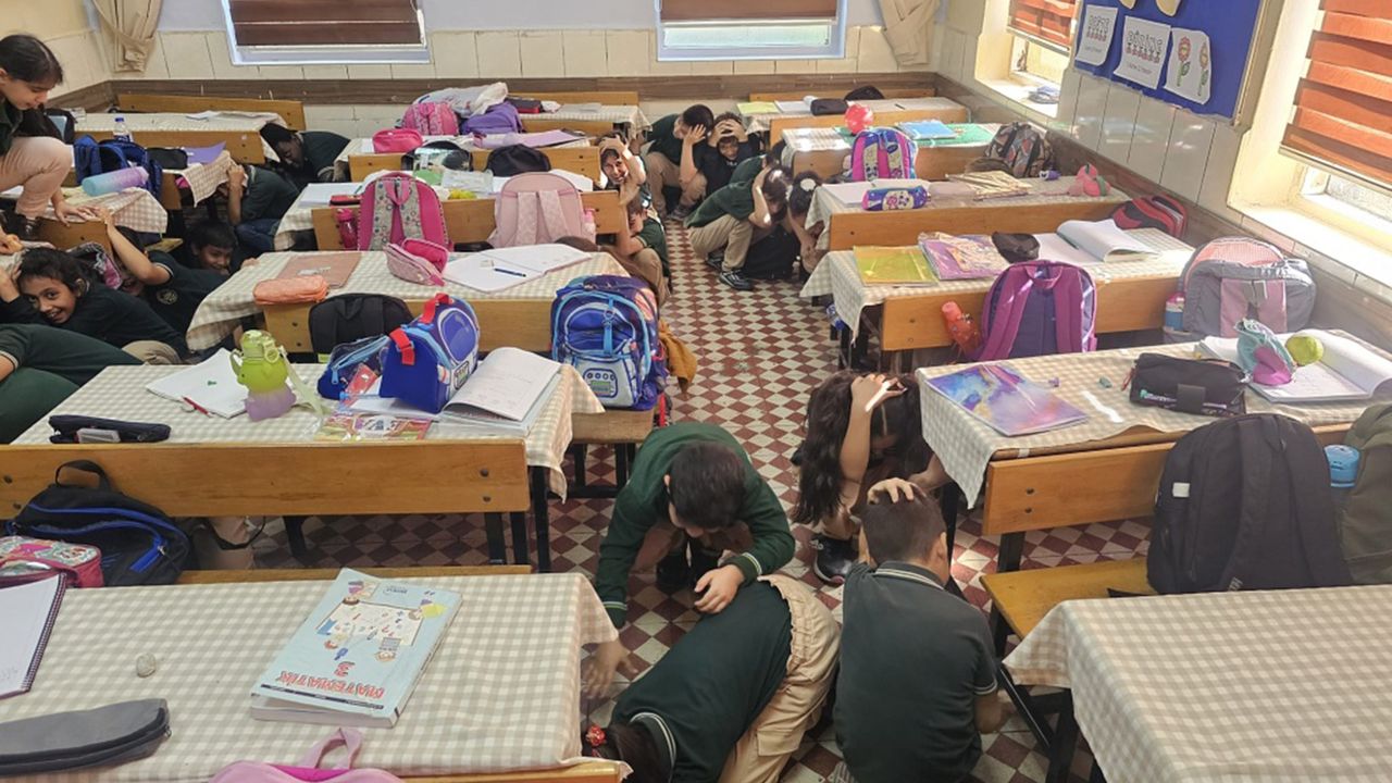 Senaryo gereği meydana gelen deprem nedeniyle siren sesleriyle başlayan tatbikatta, öğrenciler sınıflarında “çök-kapan-tutun” hareketini uyguladı.