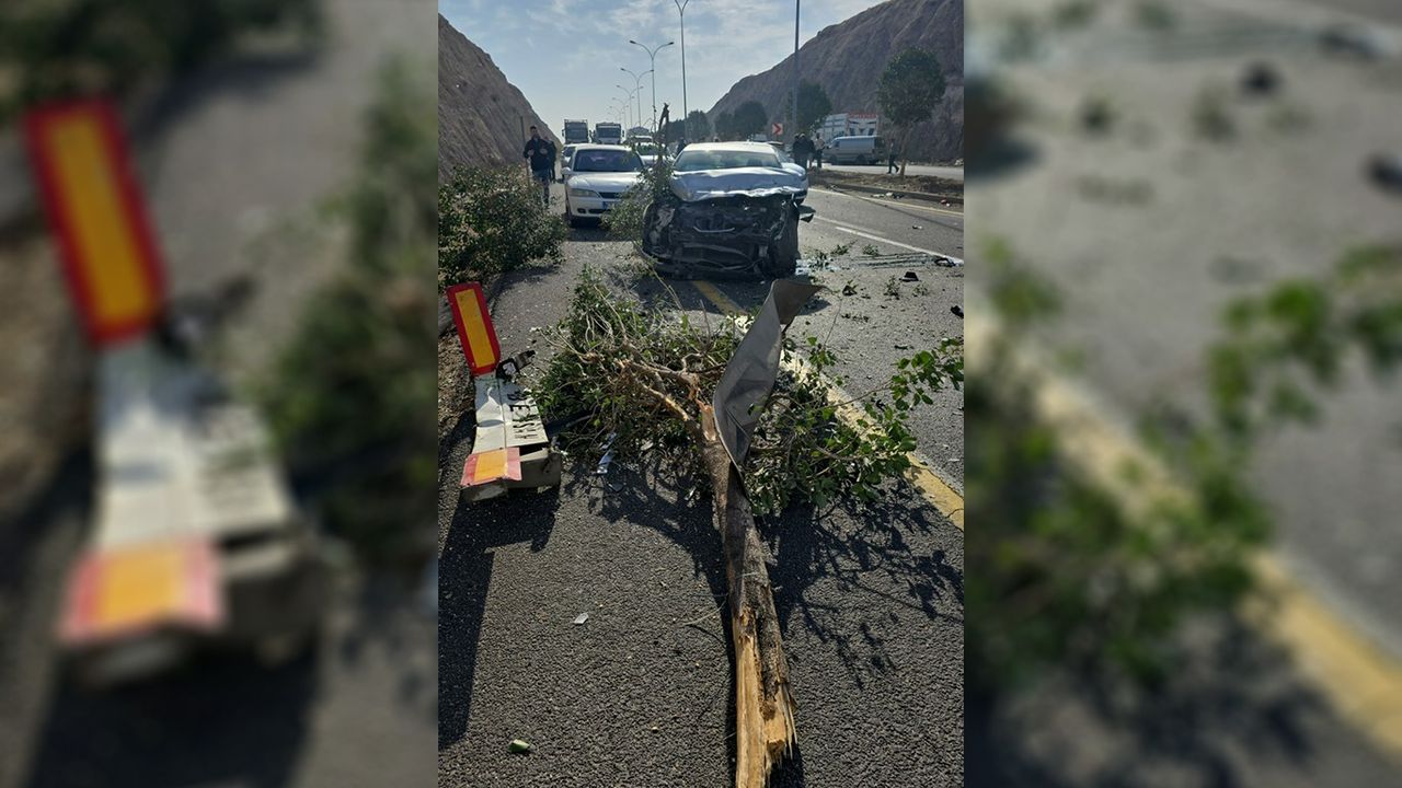 Çarpışmanın etkisiyle araçlardan biri savrularak yol kenarındaki ağaçlara çarptı ve ağaçlar yerinden söküldü.