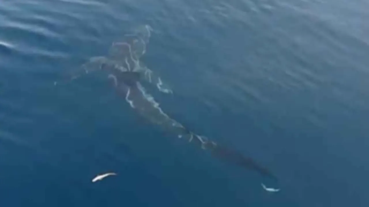 Deniz yüzeyine çıkan bu nadir canlı, balıkçılarda kısa süreli şaşkınlık yarattı. Balıkçılar, anı cep telefonlarıyla kayda alarak belgeledi.