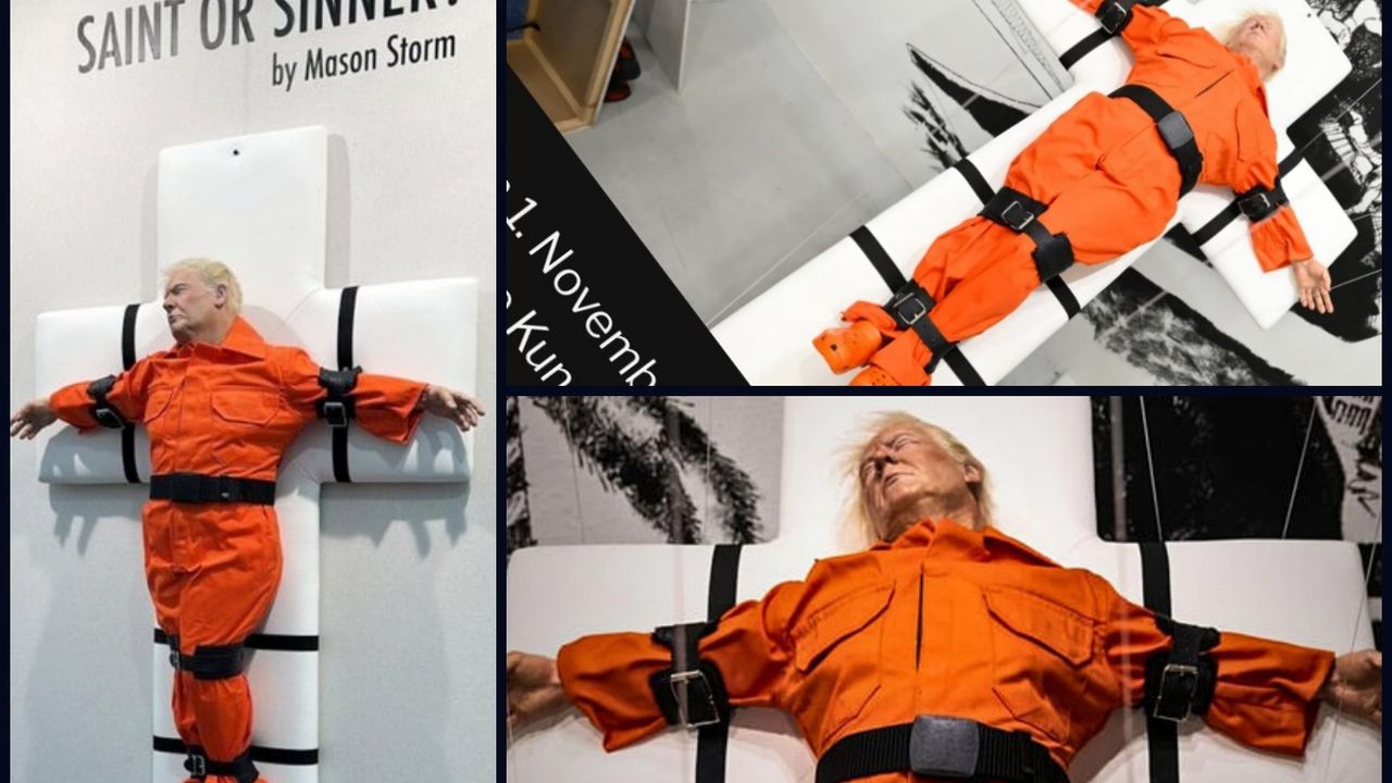 Britanyalı sanatçı Mason Storm tarafından hazırlanan ve “Saint or Sinner” adını taşıyan eser; Trump’ın turuncu cezaevi tulumu giymiş hâlde, gözleri kapalı bir biçimde beyaz bir çarmıh üzerinde yatarken görülüyor.
