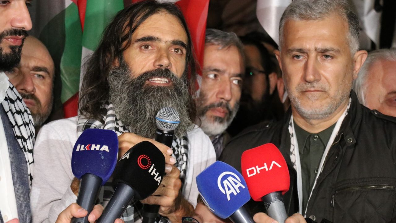 Yapılan konuşmanın ardından Sumud Aktivisti Zeynel Abidin Özkan karşılamaya gelenlerle selamlaşıp kucaklaştı. (İLKHA)
