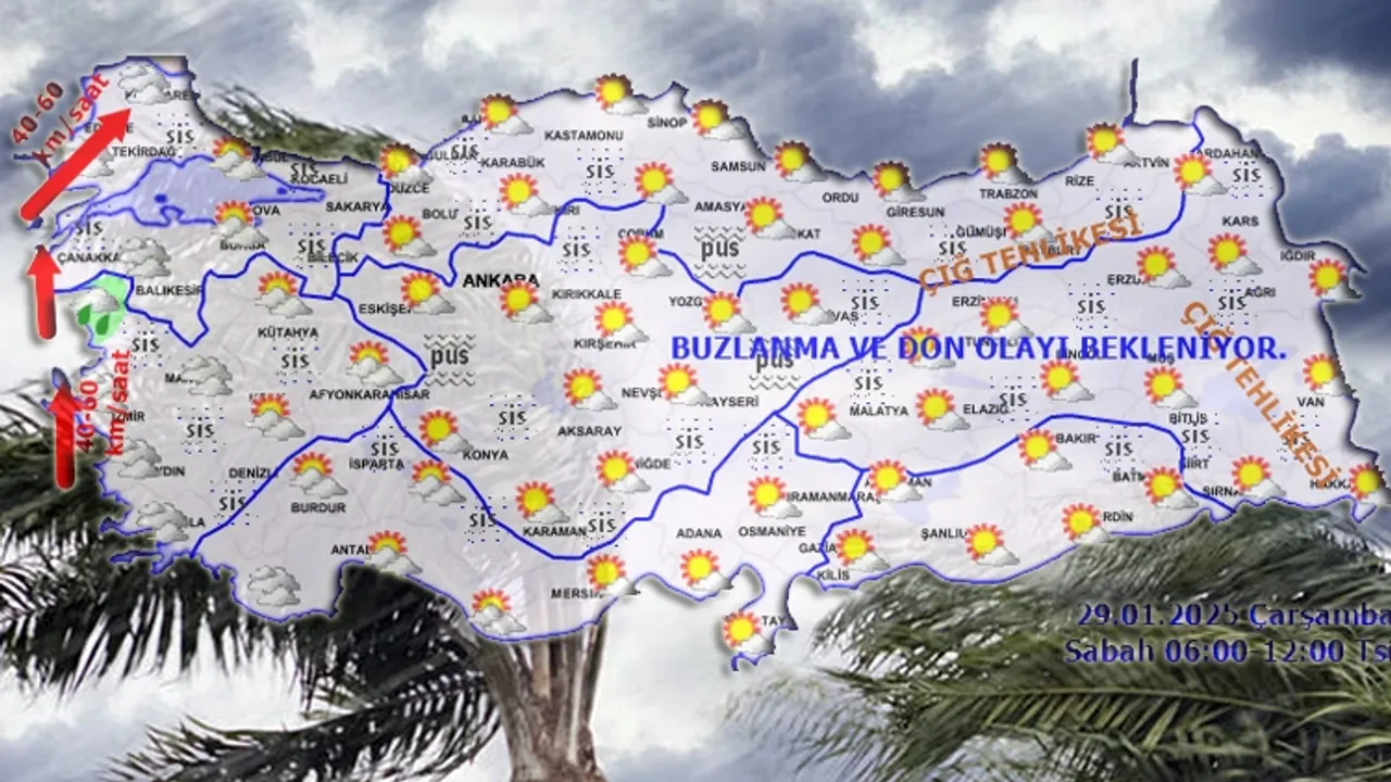Buna göre Türkiye parçalı ve yer yer çok bulutlu olacak. Kıyı Ege ile Balıkesir’in batı kıyıları, Edirne ve Çanakkale çevrelerinin hafif yağmur ve sağanak yağışlı geçeceği tahmin edilirken, iç ve doğu kesimlerde buzlanma ve don ile birlikte Marmara ile iç ve doğu kesimlerde pus ve yer yer sis olayı bekleniyor.